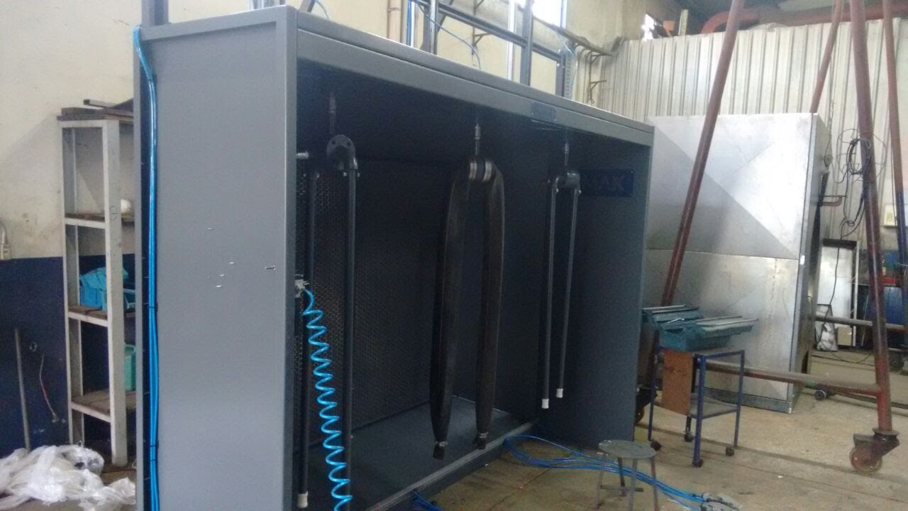Estrutura: Construída em tubo de aço carbono 30x50, em quadros desmontáveis, fechado com chapa de aço carbono com tratamento anti-corrosivo e pintura final em poliuretano cinza automak.